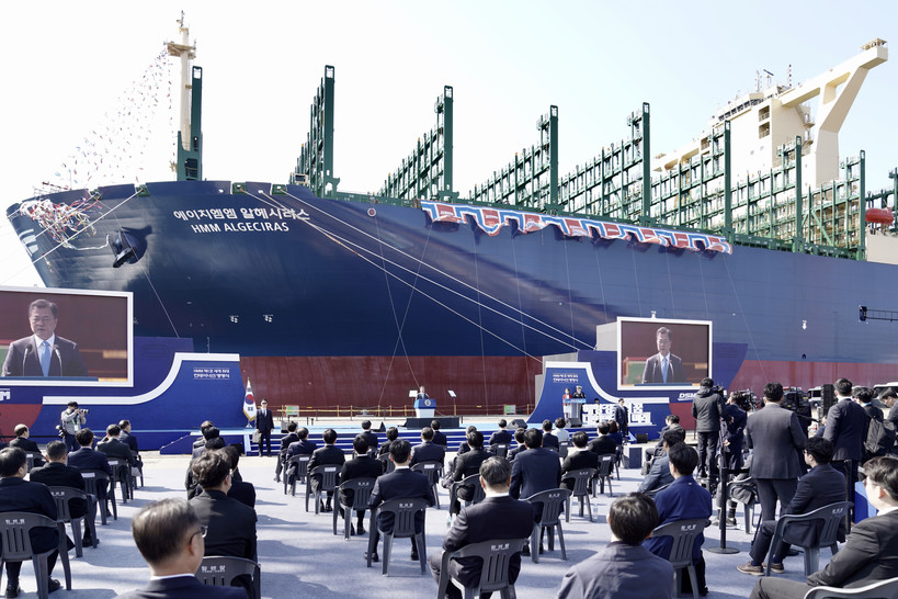 | ▲ 2020년 4월 경남 거제시 대우조선해양 옥포조선소에서 열린 세계 최대 컨테이너선 '알헤시라스' 호 명명식 장면.(사진=newsis) |