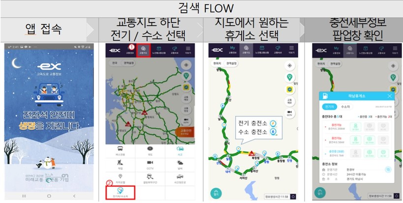 | ▲ 고속도로 교통정보 앱 통한 전기·수소차 충전시설 확인 방법. (사진=국토교통부) |