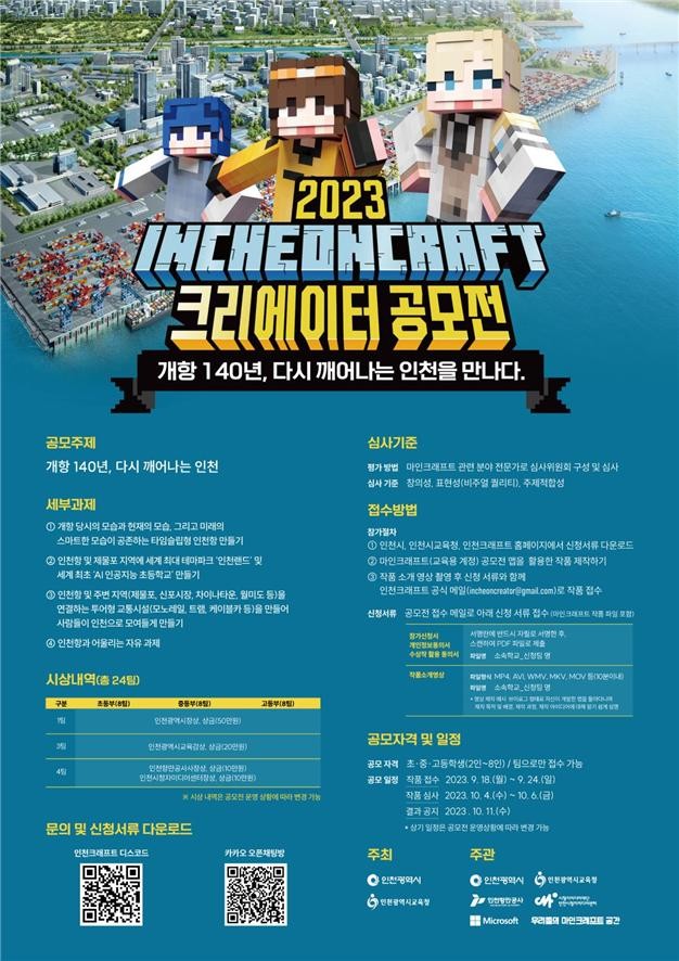 오는 9월 24일(일)까지 3개월간 진행되는 이번 공모전은 인천광역시와 인천시교육청, 인천항만공사, 마이크로소프트(MS), 국내 마인크래프트(Minecraft) 커뮤니티 ‘우리들의 마인크래프트 공간’(이하 우마공)과 함께 개최하는 시민 참여형 이벤트다.