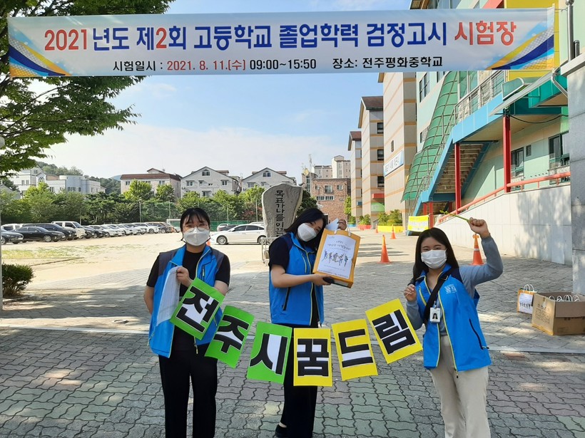 이날 전주시 꿈드림은 검정고시 고사장에 입실하는 청소년들에게 도시락과 간식, 마스크, 필기도구 등을 전달하며 합격을 응원했다.