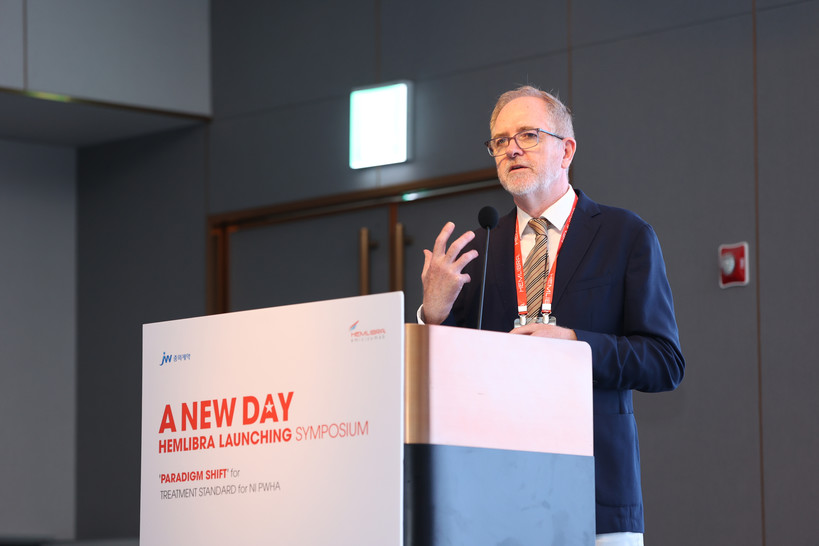 JW중외제약은 지난 7일부터 이틀간 서울 마포구 소재 ‘호텔 나루 서울-엠갤러리’에서 A형 혈우병 치료제 ‘헴리브라’ 론칭 심포지엄을 개최했다. 게리 돌란(Gerry Dolan) 영국 세인트토머스종합병원 교수가 헴리브라의 비항체 A형 혈우병 대상 치료와 다양한 환자군에 대한 케이스를 설명하고 있다.