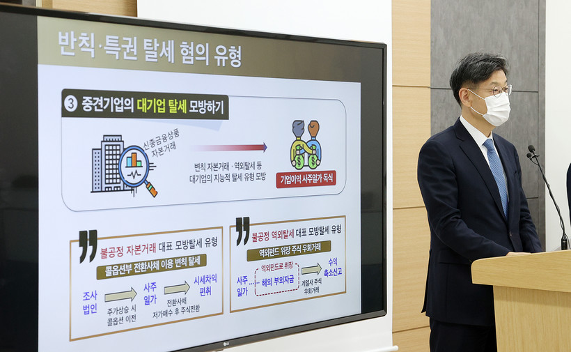 | ▲ 김동일 국세청 조사국장이 9일 오전 정부세종2청사에서 대기업 및 사주 일가 등 탈세 혐의자 30명을 세무 조사한다고 밝히고 있다.(사진=국세청) |