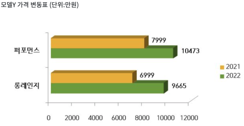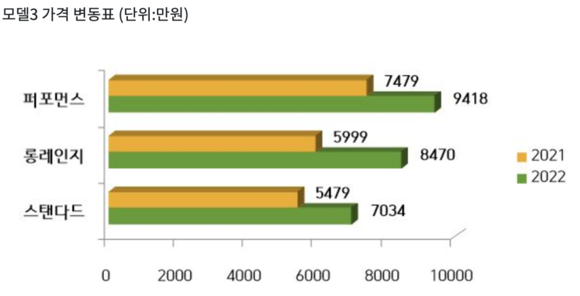 지난 7월, 테슬라 코리아는 모델3 롱레인지와 모델Y 롱레인지·퍼포먼스 트림의 가격 인상을 단행했다. 인상 후 판매가는 모델3 롱레인지 8470만 원, 모델Y 롱레인지 9665만 원, 퍼포먼스 1억 473만 원 등이다. 지난 2021년부터 지금까지 인상 폭은 모델3 롱레인지 5999만 원 ▶ 8469만 원(2470만 원, 41% 증가), 모델3 퍼포먼스 7479만 원 ▶ 9418만 원(1939만 원, 26% 증가), 모델Y 퍼포먼스 7999만 원 ▶ 1억 473만 원(2474만 원, 31% 증가) 등으로 나타났다.