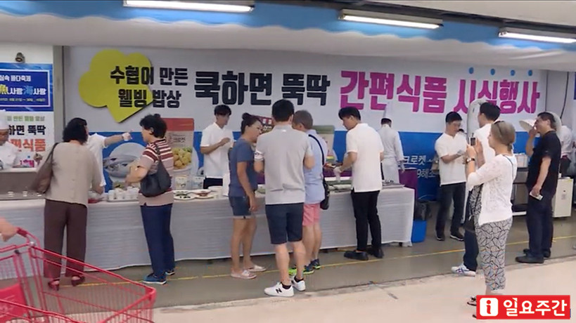 | ▲ 마트에 마련된 수산물 간편식 시식행사 모습 (이미지편집=일요주간) |