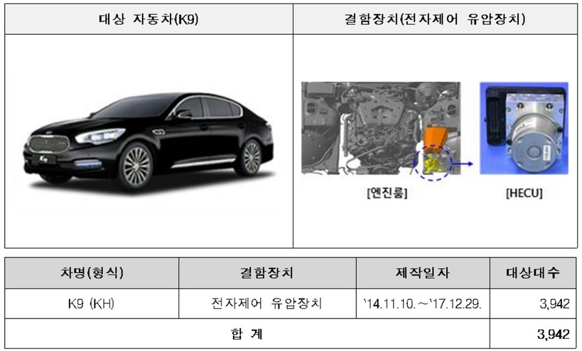 기아의 K9 3942대는 전자제어 유압장치(HECU) 내부 합선으로 화재가 발생할 가능성이 발견됐다.