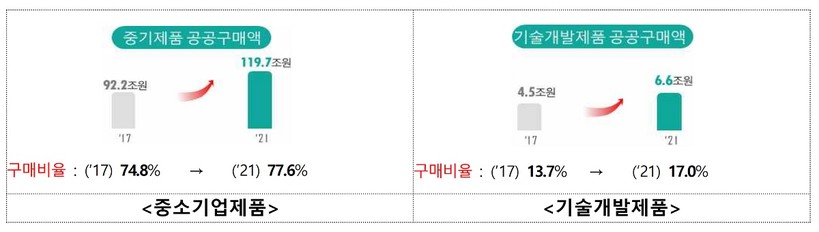지난해 기준으로 약 48만개 중소기업이 공공조달 시장에 참여했으며 매년 참여기업이 늘어나는 추세다. 지난해 중기제품 구매는 2017년보다 27조 5000억원이 늘었다. 중소기업 기술개발제품도 지난 5년간 2조 1000억원이 증가했다.