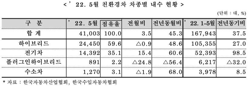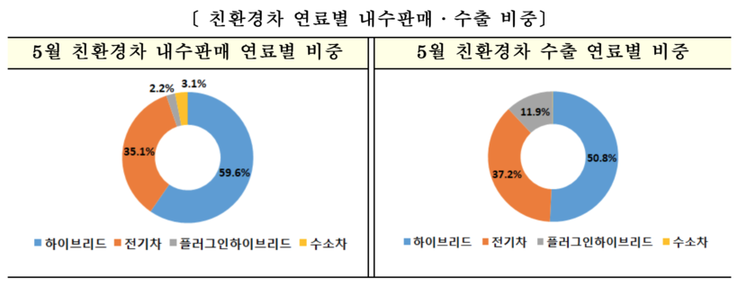 친환경차의 내수 판매는 전년동월 대비 45.3% 증가한 4만 1003대를 판매해 3개월 연속 최고치 경신 및 월 판매대수 최초 4만대를 돌파했다.