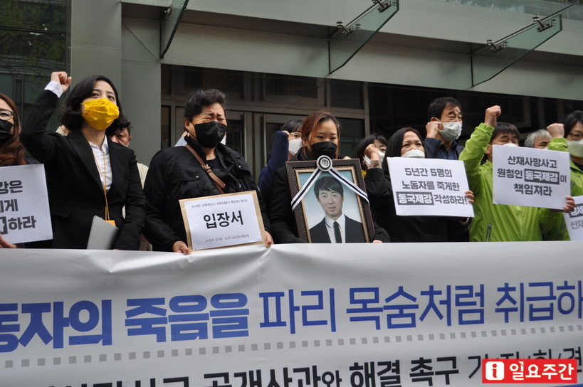 | ▲중대재해처벌법이 지난 1월 시행 됐지만 여전히 산업현장에서는 노동자들의 산재사고가 끊이지 않고 발생하고 있다. 사진은 동국제강 비정규직노동자 산재사망사고 해결 촉구 지원모임 기자회견 모습이다.(사진=성지온 기자) |