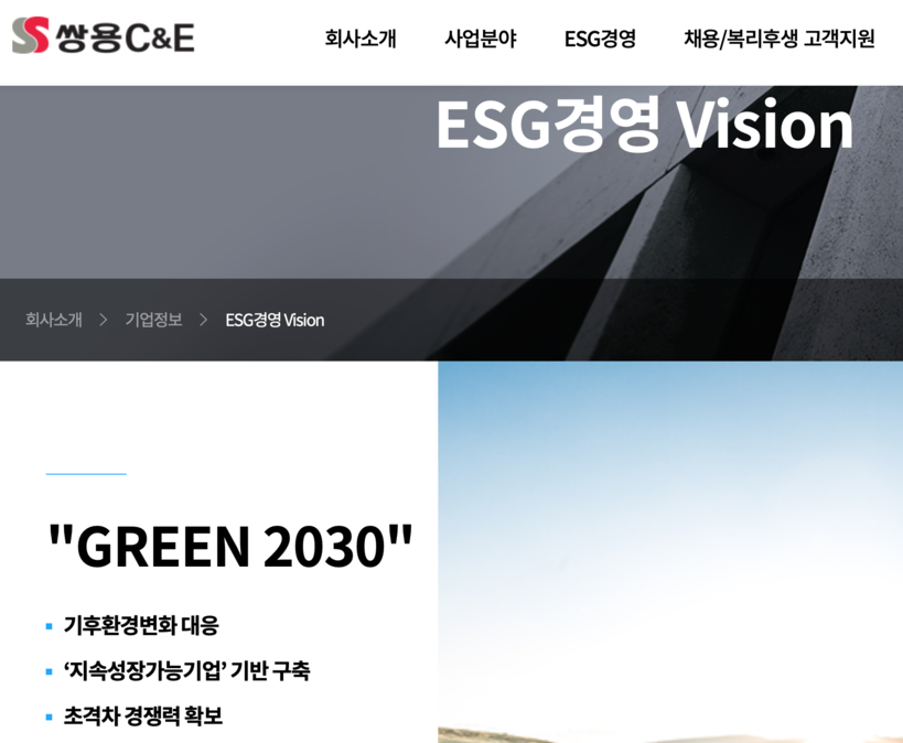 지난 2021년 3월 26일 쌍용C&E는 주력해왔던 시멘트 사업에서 환경 분야로 사업 영역을 확장하고 친환경 자원순환형 사회를 선도하는 종합환경기업으로 도약하겠다며 ‘그린2030’(Green2030) 비전을 발표하고 ESG 경영도 천명한 바 있다.