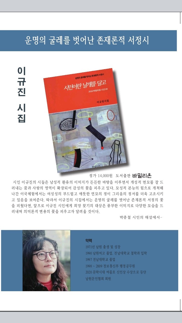 [일요주간 = 이태곤 기자] 이규진시인 처음 발견한 시집 “시인이란 날개를 달고”를 출간했다.