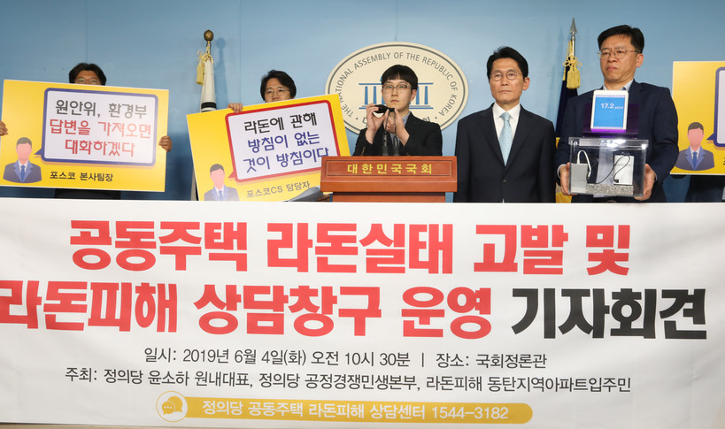 | ▲지난 2019년 8월 정의당 공정경쟁민생본부, 라돈피해 동탄지역 아파트 입주민들이 라돈실태 고발 및 피해 상담창구 운영 기자회견을 하고 있다.(사진=newsis) |
