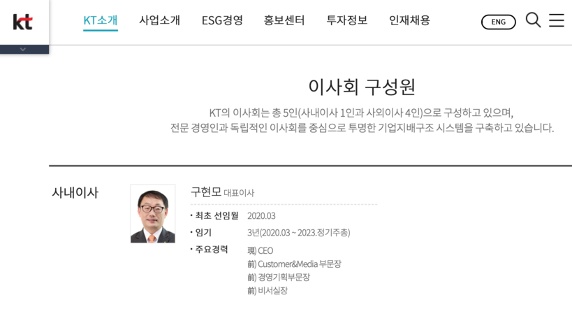 | ▲ 2일 KT홈페이지에는 구현모 전 사장이 대표이사, 사내이사로 소개돼 있다.(사진=KT홈페이지 갈무리) |