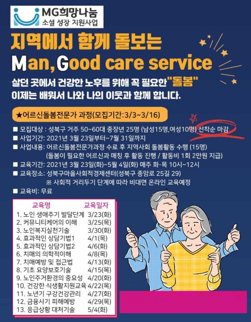 어르신돌봄전문가 과정은 돌봄 사각지대에 놓인 취약계층 대상 돌봄 수요를 발굴하고 이들에 대한 돌봄 활동을 수행할 전문 인력을 양성하는 프로그램이다. 성북의료복지사회적협동조합과 ‘MG희망나눔 소셜성장 지원사업’의 하나로 운영되고 있다.