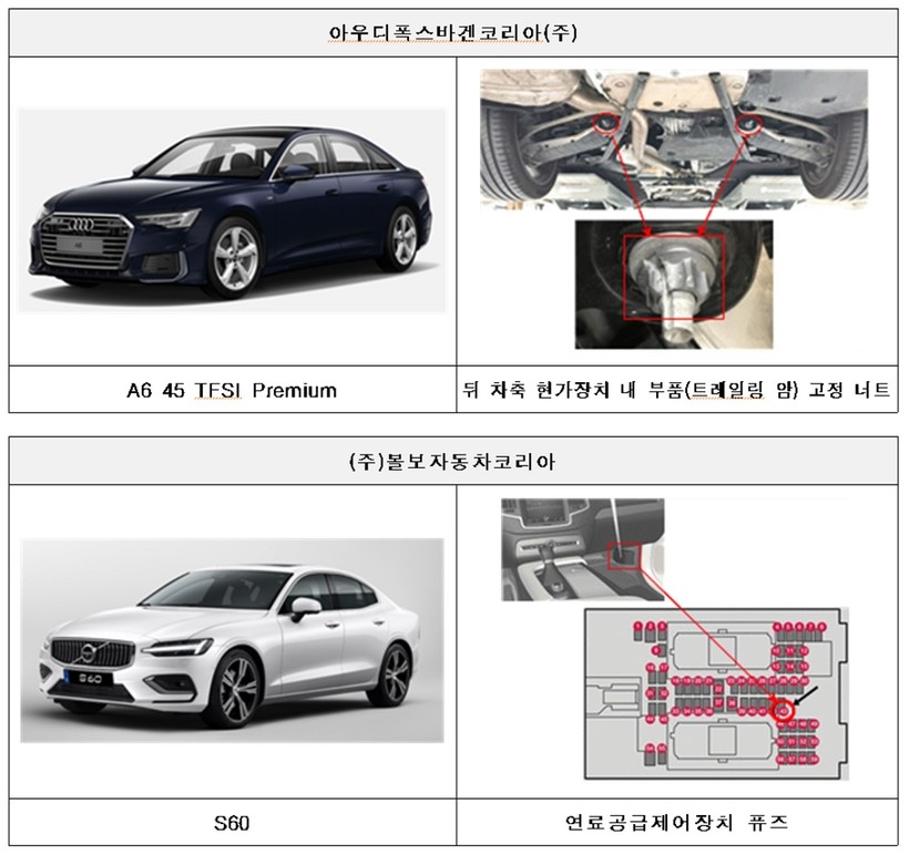 우선 아우디폭스바겐코리아의 A6 45 TFSI 프리미엄 등 46개 차종 9759대(판매 이전 포함)는 뒤 차축 현가장치 내 부품(트레일링 암) 고정 너트의 강성 부족으로 너트가 파손되고, 이로 인해 차체 안정성이 상실될 가능성이 나타났다.