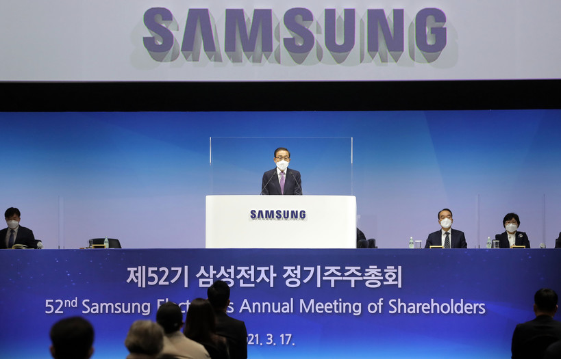 | ▲김기남 삼성전자 대표이사 부회장이 17일 경기도 수원시 수원컨벤션센터에서 열린 제52기 삼성전자 정기주주총회에서 발언을 하고 있다.(사진=newsis) |