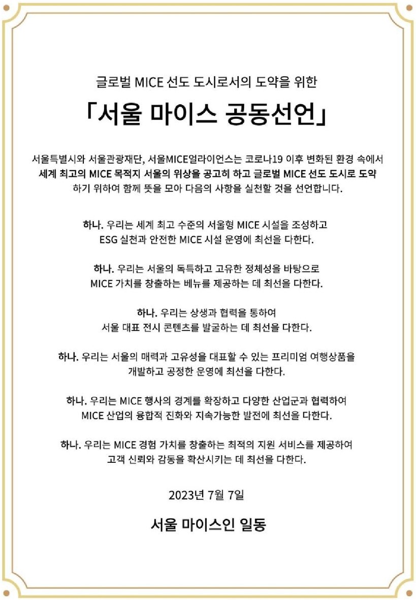 ‘서울 마이스 공동선언’은 코로나19 이후 변화된 마이스 생태계 체질을 개선하고 질적 성장을 도모해 글로벌 마이스 선도도시로 도약하고자 마련된 미래 비전이자, 마이스 민-관 합동 공동선언이다.