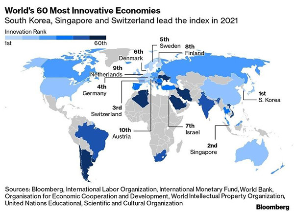 [일요주간 = 노현주 기자] 한국이 ‘2021년 블룸버그 혁신지수’ 평가에서 90.49점으로 60개국 중 세계 1위를 차지했다.