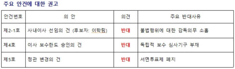 CGCG는 “이 사건에 대한 공정위 의결서가 아직 공개되지 않아 현재로서는 이학림 후보의 담합 직접 관여 여부는 확인할 수 없다”면서도 “이학림 후보가 경영기획 담당 이사로서 회사의 불법행위에 대한 감독의무를 소홀히 했다고 판단해 반대를 권고한다”고 밝혔다.