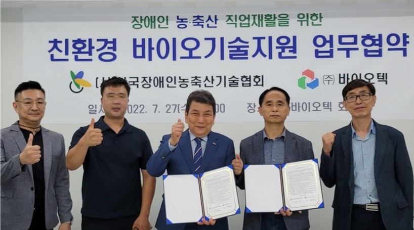 [일요주간 = 조무정 기자] 축산업계의 난제들을 하나하나 해결해 나가면서 업계로부터 관심을 받고 있는 (주)바이오텍(대표이사 박덕수)은 27일 (사)한국장애인농축산기술협회와 업무협약을 맺고 상호 상생협력을 해 나가기로 했다.