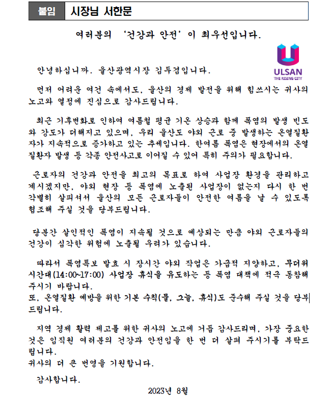 [일요주간=김영란 기자] 울산시는 김두겸 울산시장이 8월 7일 지역 내 2,450여 개 기업체 대표들에게 무더위휴식제 참여 독려와 온열질환 예방 기본 수칙(물, 그늘, 휴식 제공) 준수를 당부하기 위해 서한문을 발송한다고 밝혔다.