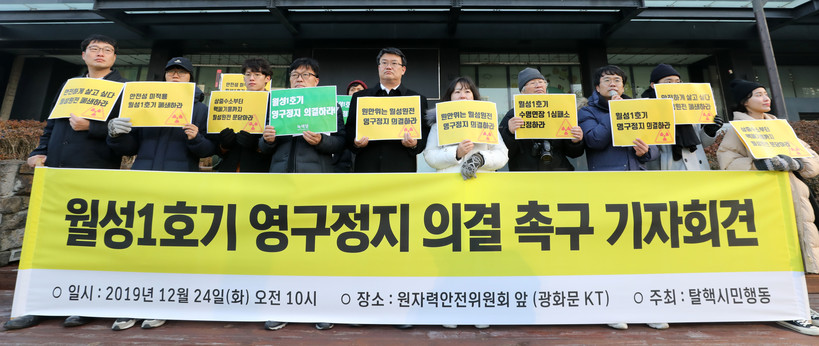 | ▲ 24일 오전 서울 종로구 원자력안전위원회 앞에서 진행된 탈핵시민행동 기자회견 (사진=뉴시스) |