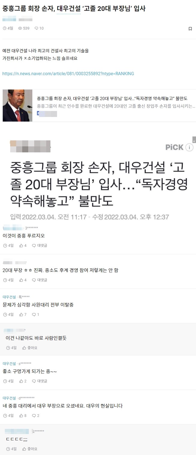 일례로 직장인 익명앱 <블라인드>에서는 위 내용으로 쓴 기사 반응으로 ‘중소(기업)도 후계 경영 참여 저렇게는 안 함’, ‘최고 기술을 가진 회사가 중소기업화되는 느낌 슬프네요’, ‘전략기획부장은 너무하다.’, ‘조선 시대 신분제’, ‘(회사) 다닐 맛 안 나겠다.’ 등이 있었다. 일부 대우건설 직원 역시 ‘문제가 심각함. 사원, 대리 전부 이탈 중’, ‘구멍가게 되어 가는 중’, ‘중흥 대리에서 대우 부장으로 오셨다. 대우의 현실’ 등과 같은 반응이었다.