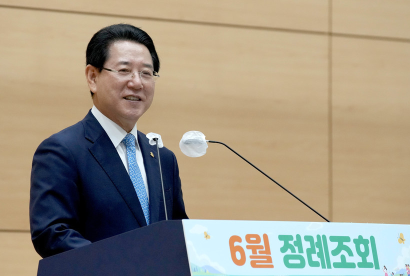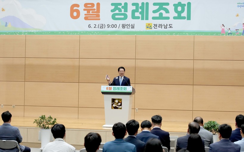| ▲ 공감과 소통을 위한 6월 정례조회_전라남도가 전남의 미래성장을 견인할 시군 핵심 동력사업을 육성하기 위한 2023년 전남형 균형발전 300 프로젝트 공모에 4개 사업을 선정했다. 김영록 전라남도지사가 지난 6월 2일 정례조회에서 조직개편으로 신설되는 균형성과담당관실에 전남 균형발전 전략을 잘 준비할 것을 지시하는 모습.(사진=전남도) |