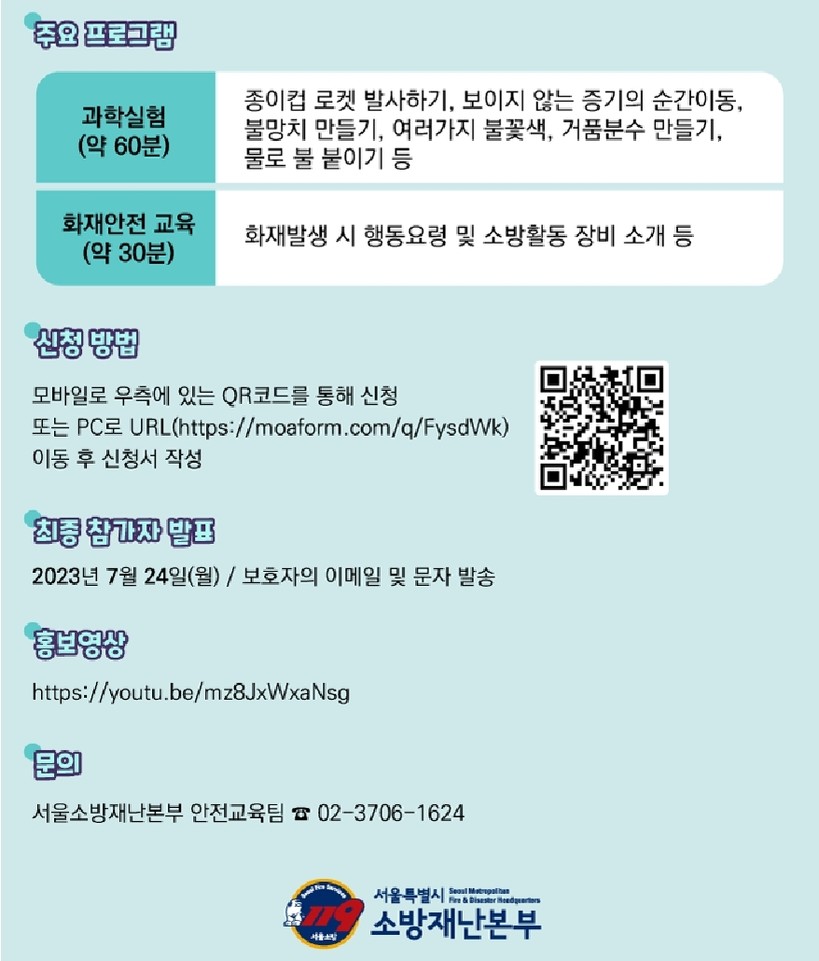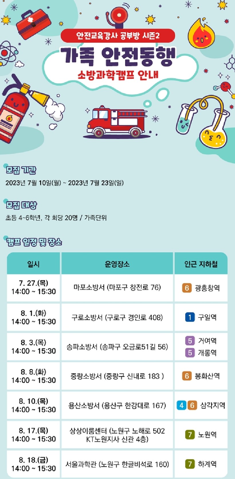 이번 캠프는 서울시 소재 초등학교 4~6학년이면 누구나 참여 가능하고 1회당 학생 기준 20명으로 가족단위 참석도 가능하다. 프로그램은 과학실험 1시간, 화재안전교육 30분으로 진행된다.