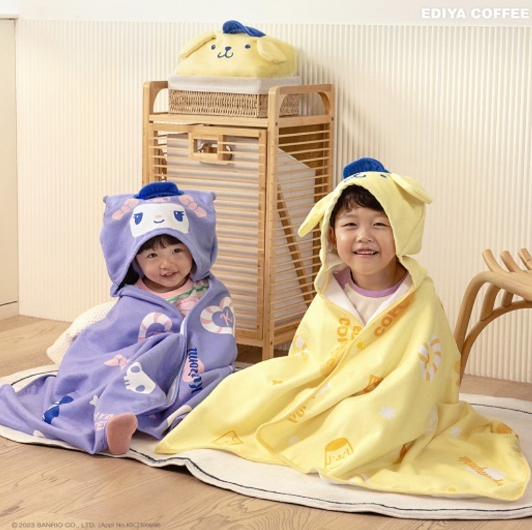스낵접시는 ‘마이멜로디’와 ‘시나모롤’ 캐릭터의 얼굴을 형상화했다. 후드타월은 ‘쿠로미’와 ‘폼폼푸린’ 캐릭터와 맞는 보라색, 노란색 타월에 캐릭터 얼굴 후드를 더했다.