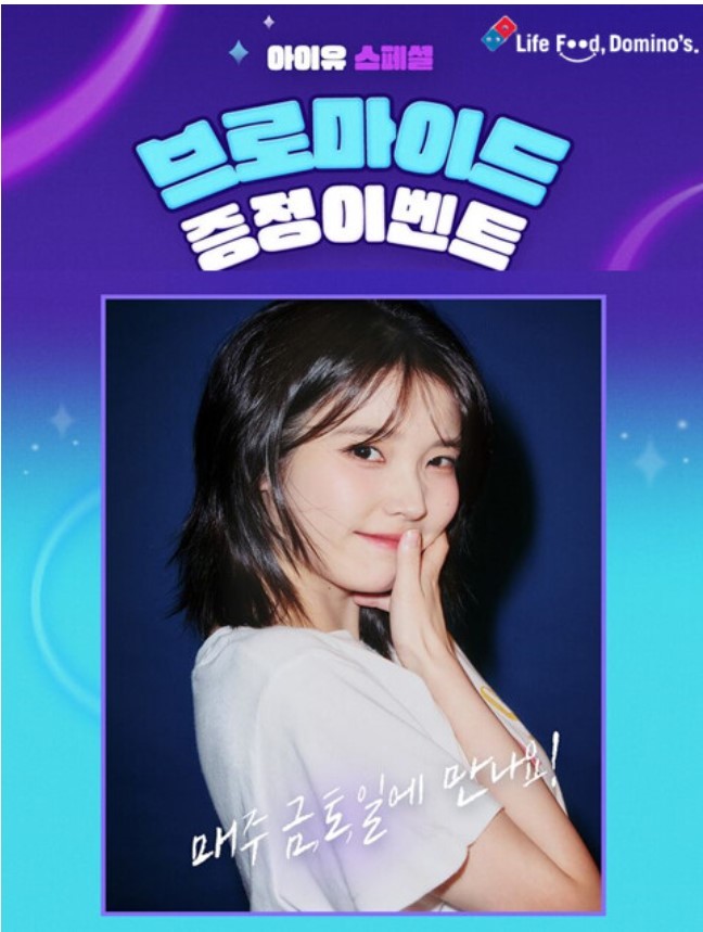 이번 이벤트는 도미노피자의 ‘치즈 크레이프 샌드 피자(L)’ 구매 또는 최종 결제 금액 3만 원 이상 온라인 포장 주문한 19세 이상 온라인 성인 회원을 대상으로 한다. 매주 금·토·일요일 선착순 5000명에게 아이유 브로마이드르 준다.