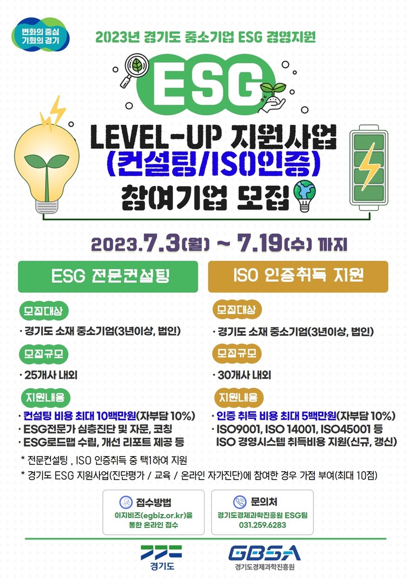 경기도는 오는 19일까지 이지비즈(www.egbiz.or.kr)를 통해 환경·사회·투명(ESG) 경영 전문 컨설팅은 25개 사, 환경·사회·투명(ESG) 경영 관련 국제 인증 취득 지원은 30개 사를 모집한다.