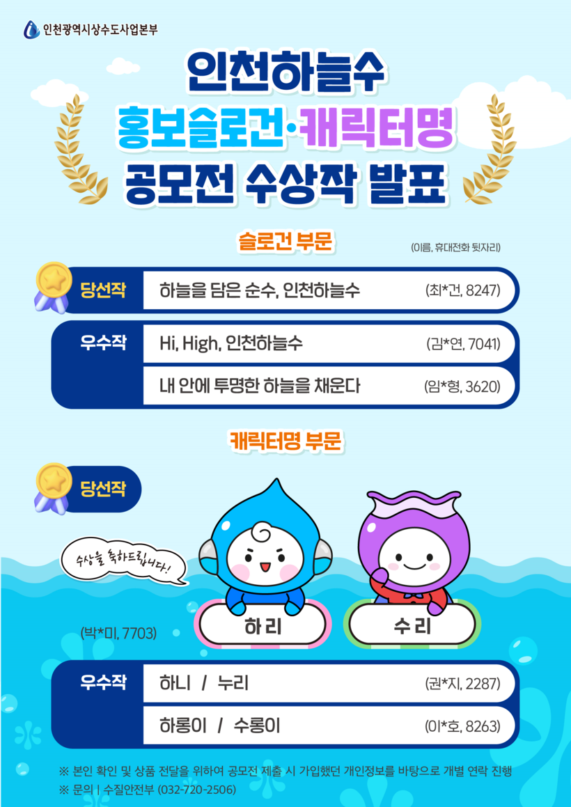 [일요주간=김영란 기자] 인천광역시(시장 유정복) 상수도사업본부는 인천 수돗물의 새로운 브랜드 가치를 시민과 함께 만들기 위해 ‘인천하늘수 홍보 슬로건·캐릭터명 공모전’을 실시하고 최종 당선작을 선정했다.