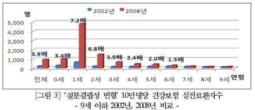 10만명당 실진료환자수의 증가폭이 가장 큰 9세 이하의 경우 1세가 7.2배(2002년 666명→2008년 4809명)로 두드러지게 증가했으며, 2세 6.8배(2002년 221명→2008년 1500명), 3세 3.9배(2002년 171명→2008년 672명), 4세 2.4배(2002년 201명→2008년 476명), 5세 2.0배(2002년 215명→2008년 440명)순으로 나타났다.