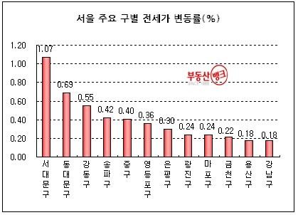 서울은 도심과 강남업무지구 주변의 상승세가 계속되고 있다. 서대문구가 1.07%의 변동률을 기록한 가운데 동대문구(0.69%), 강동구(0.55%), 송파구(0.42%) 등도 상승세를 보였다. 특히 이번 주에는 지난 주 마이너스 변동률울 기록했던 은평구(0.30%), 금천구(0.22%), 노원구(0.14%)등이 전세수요의 증가로 반등에 성공하는 등 서울 25개 구 중 하락세를 보인 곳은 단 한군데도 없었다.
