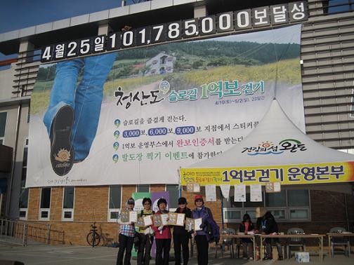 ‘2010년 청산도 슬로우걷기 축제’ 일환으로 진행된 ‘슬로길 1억보 걷기’는 축제 참가객들이 슬로길을 걷는 걸음수의 누적합이 1억보가 되도록 하는 프로그램이다.