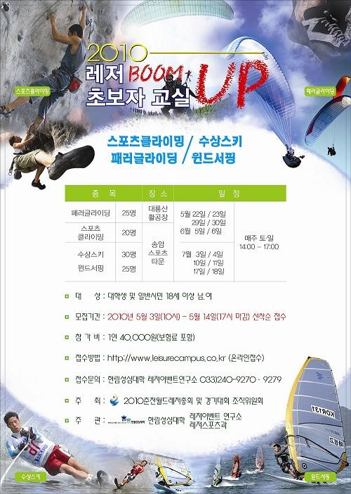2010춘천월드레저총회 및 경기대회 조직위원회(위원장 손은남)가 춘천송암스포츠타운과 대룡산 활공장에서 5월 22일부터 7월 18일까지 매 주말마다 운영하는 레저스포츠 초보자교실을 개강한다.