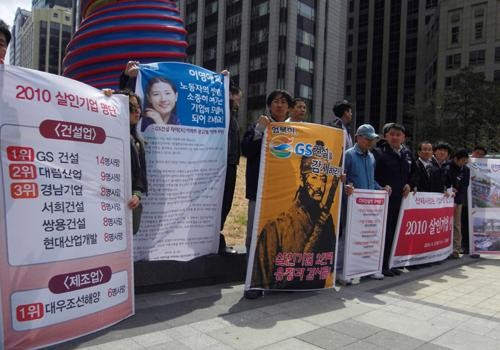 이어 “이번에 최악의 살인기업으로 선정된 GS 건설은 이러한 한국 기업의 실체를 적나라하게 보여 주고 있다. 노동자 건강에 대한 무관심과 무책임, 법을 무시한 이윤 추구 행태 등이 복합되어 죄 없는 노동자가 이유 없이 죽어가고 있다”고 덧붙였다.