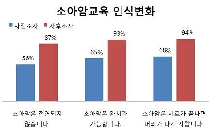 소아암교육을 받은 급우를 대상으로 소아암에 대한 인식변화를 조사한 결과 ‘소아암은 전염되지 않는다’는 응답이 56%에서 87%로, ‘소아암은 완치가 가능하다’는 응답이 65%에서 93%로, ‘소아암 치료가 끝나면 머리가 다시 자란다’는 응답이 68%에서 94%로 높아져 교육의 효과성이 높음을 알 수 있다.