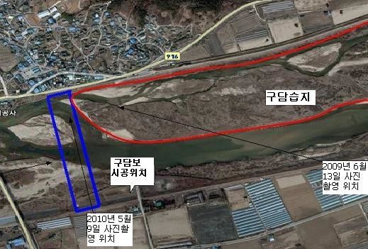 한겨레신문이 구담습지의 훼손된 현재 모습이라고 보도한 사진은 파란색 구역 방향에서 찍은 것이고, 2009년 6월13일과 2010년 5월12일에 촬영한 사진의 모습은 오른쪽 빨간색 구역의 구담습지이다. 한겨레 보도와 달리 구담습지는 원형 그대로 보전돼 있음을 볼 수 있다.
