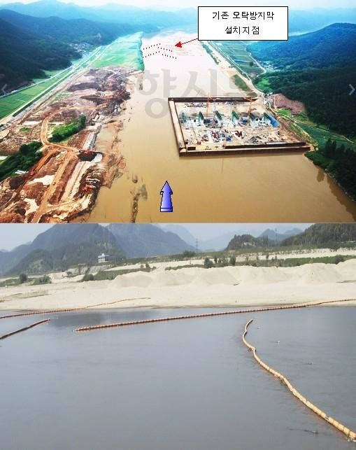 | ▲ 경향신문 5월31일자의 흙탕물 사진(위쪽)과 수자원공사가 공개한 보하류부에 설치된 오탁방지막 전경 사진. | ||