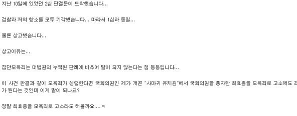 그러면서 “이 사건 판결과 같이 모욕죄가 성립한다면 국회의원인 제가 개콘(개그콘서트) ‘사마귀 유치원’에서 국회의원을 풍자한 최효종을 모욕죄로 고소해도 죄가 된다는 것인데, 이게 말이 되나요?”라고 반문했다.