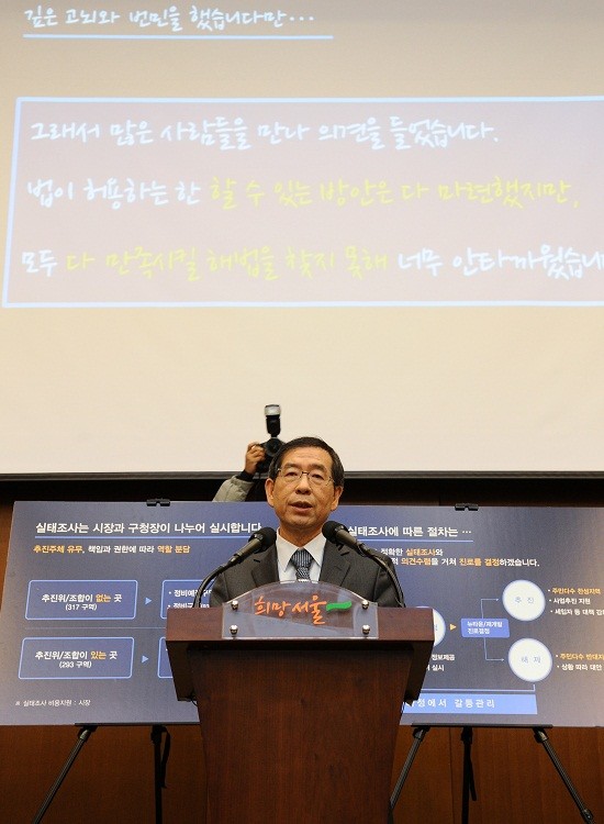 이 날 박 시장은 "영세 가옥주․상인․세입자 등 사회적 약자를 눈물 흘리게 하는 일이 없도록 전면철거 방식의 뉴타운․정비사업 관행을 바꾸겠다'는 뜻을 밝혔다.