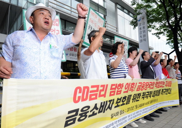 | ▲ 서민금융보호네트워크 등 시민단체 회원들이 지난 24일 오후 서울 여의도 금융위원회 앞에서 CD금리 담합 의혹과 관련해 금융당국의 책임 있는 자세와 금융소비자 보호를 위한 적극적인 대처를 촉구하는 기자회견을 하고 있다. | ||