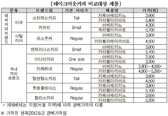 한편 커피전문점 테이크아웃커피의 종합정보는 공정거래위원회 ‘스마트컨슈머 (www.smartconsumer.go.kr)’ 내 ‘비교공감’란을 통해 제공할 예정이다.