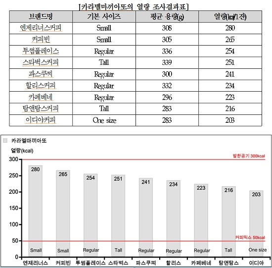 아메리카노의 열량은 10㎉에 불과하지만, 카라멜마끼아또 기본 사이즈 한 잔의 평균 열량은 241㎉로써 밥 한 공기나 후라이드 치킨 한 조각 등의 열량과 맞먹는 것으로 나타났기 때문이다.