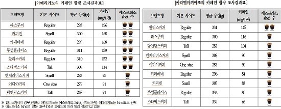 9개 브랜드의 아메리카노에 들어있는 카페인 함량을 측정한 결과, 에스프레소 2shot을 넣는 것은 6개 브랜드이며, 아메리카노 1잔에 들어있는 카페인함량은 파스쿠찌 196㎎, 커피빈 168㎎, 카페베네 168㎎, 투썸플레이스 159㎎, 할리스 152㎎, 스타벅스 114㎎으로 측정되었다. 에스프레소를 1shot만 넣는 나머지 3개 브랜드의 경우에는 엔제리너스커피 95㎎, 탐앤탐스커피 91㎎, 이디야커피 91㎎이었다.