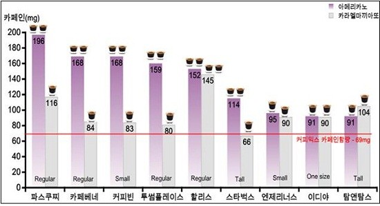 카라멜마끼아또의 경우에도 1잔당 카페인 함량을 측정한 결과, 스타벅스커피가 66㎎로 가장 낮고 할리스커피가 145㎎으로 가장 높아 브랜드에 따라 최대 2배 이상 차이를 보였다.