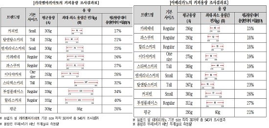 아메리카노의 경우 9개 브랜드 전체의 평균용량은 295g이고 최대·최소 용량간 편차는 평균 60g이었는데, 이 중 편차가 가장 큰 것은 투썸플레이스 83g(평균용량 311g의 27%), 커피빈 77g(평균용량 300g의 26%)인 것으로 나타났다.