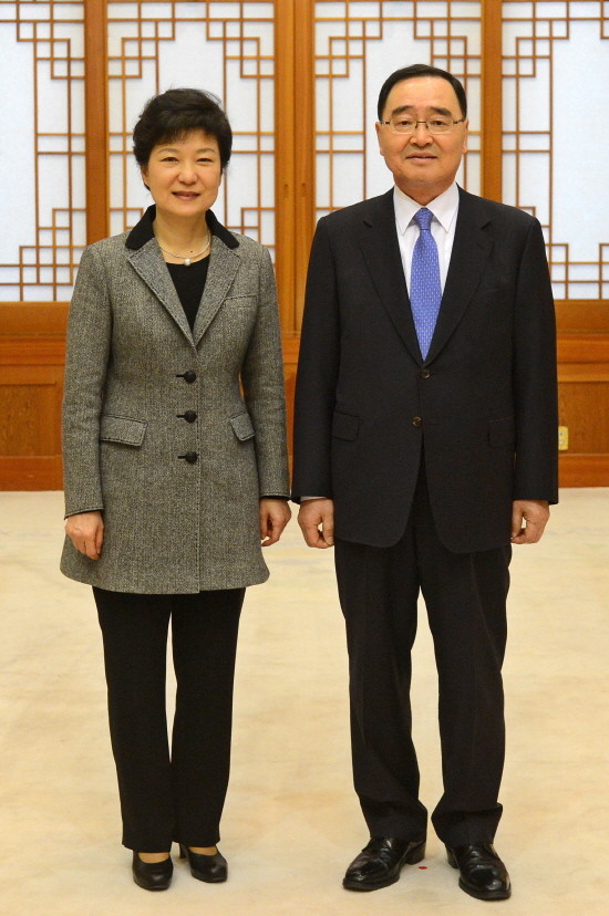 박 대통령은 정 총리에게 임명장을 수여하며 좀처럼 결정이 되지 않고 있는 정부조직법 개정안에 대해 정 총리가 중심을 잡아 각 부처가 잘 돌아갈 수 있도록 도와줄 것을 당부했다.