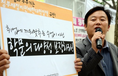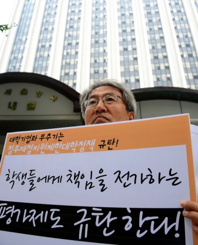 10일 반값등록금국민본부(안진걸 공동집행위원장)이 는 서울 종로구 세종로 정부서울청사 후문에서 대학의 기업화를 부추기는 정부의 정책을 규탄하는 기자회견을 열고 정부재정지원제한대학 선정 정책을 비난했다.